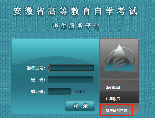考生在注冊之后,沒有及時將準考證號記錄下來也不用擔心,考生可以進入安徽省教育招生考試院-自學考試欄目,選擇頁面左側(cè)目錄欄中的“考生服務平臺(含報名)”,點擊“準考證號查詢”按鈕(如下圖所示),輸入身份證號、姓名,選擇報名地市,即可查看本人的準考證號。