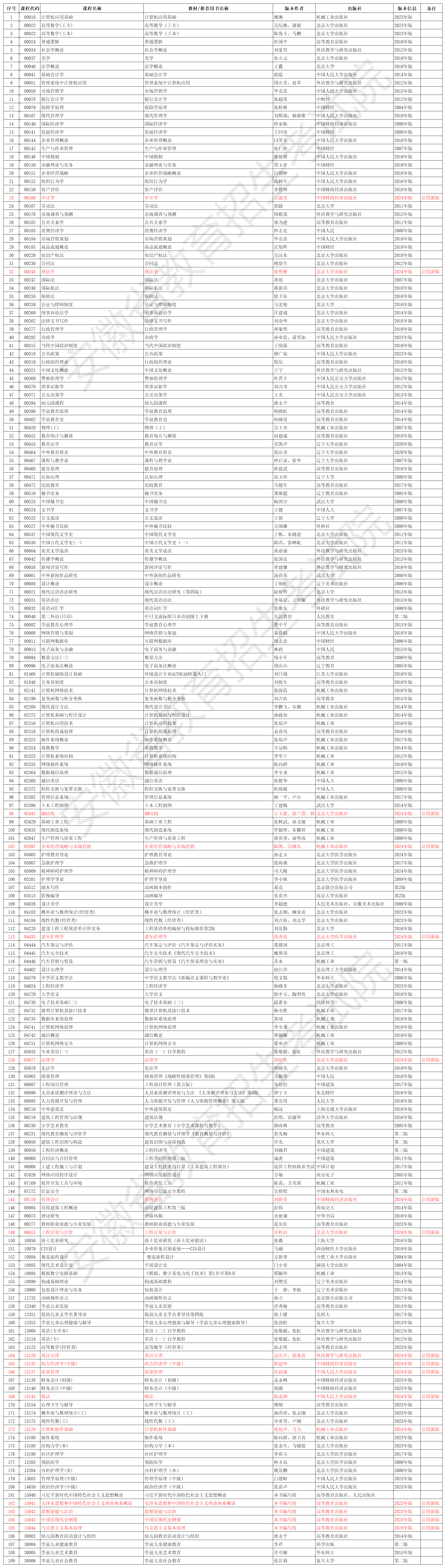 安徽省高等教育自學考試2025年4月考試教材版本目錄