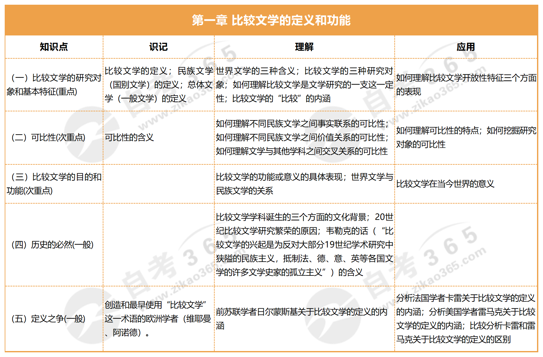 自考比較文學研究這科內容廣泛且知識點較多,但考生并不需要毫無頭緒地逐個知識點去辛苦研讀。事實上,自考都會存在一定的側重點和出題傾向性。考生只需按照下方表格中標注的考核和復習要求來學習,會對各類題型心中有數,有的放矢。