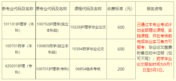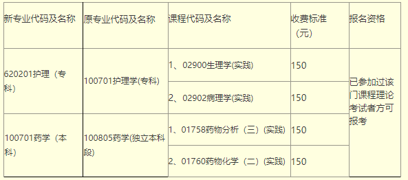 三、2021年下半年福建醫科大學自考實踐性環節考核報考科目、收費標準、報名資格(見表一、表二)