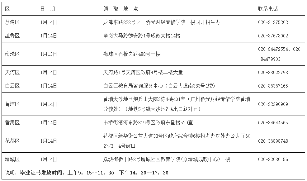 經廣東省自學考試委員會審核,廣州市2020年9月自學考試畢業證書辦理工作已完成。請考生本人在規定的時間憑身份證和畢業登記回執,到辦理畢業登記申請和初審的區招考辦指定地點領取畢業證書(或審核未通過的退檔材料)。具體時間安排如下: