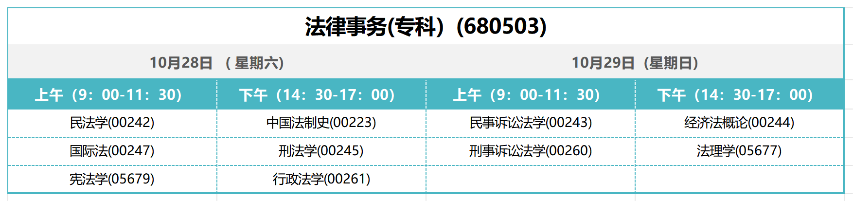 想備考2023年10月黑龍江自考??频膶W員,如果你選擇法律事務??茖I,報考時請認準專業代碼680503,考試安排在10月28日-29日。上午考一科,時間為9:00-11:30,下午考一科,時間為14:30-17:00,2天總共可考4科。
