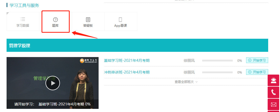 進(jìn)入“我的網(wǎng)校我的家”首頁,在我的課程-正在學(xué)習(xí)中,找到“學(xué)習(xí)工具與服務(wù)”,點(diǎn)擊題庫,進(jìn)入后選擇相應(yīng)題庫練習(xí)即可。