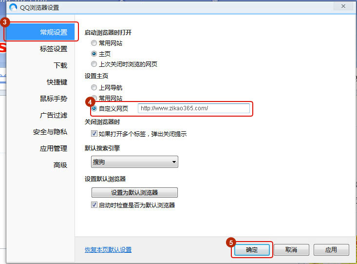 選擇常規選項, 在啟動設置里選擇自定義網址,并輸入m.ssgshop.cn,點擊確定。