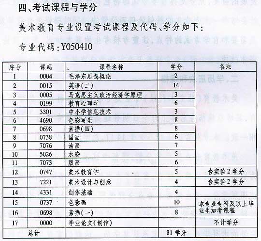 美術教育(獨立本科段)專業是專科后的本科層次的學歷教育,其培養規格在總體上與全日制普通高校同類專業的本科水平相一致。本專業考試課程不少于14門,總學分不少于81學分。