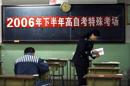 10月21日,上午北京第二監獄自考特殊考場。10點48分還剩一名服刑人員正在緊張的答卷,監考民警正在整理卷紙。現在距離第一節考試結束只有12分鐘。