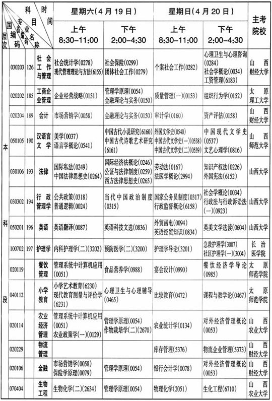 山西省08年4月自學考試科目及時間表