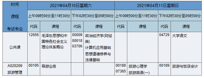 2021年4月湖南自考專科旅游管理專業考試時間為2021年4月10日-11日,2021年4月湖南自考專科旅游管理專業課程安排如下: