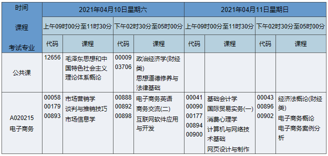 2021年4月湖南自考專科電子商務專業考試時間為2021年4月10日-11日,2021年4月湖南自考專科電子商務專業課程安排如下: