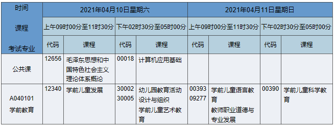 2021年4月湖南自考專科學前教育專業考試時間為2021年4月10日-11日,2021年4月湖南自考專科學前教育專業課程安排如下: