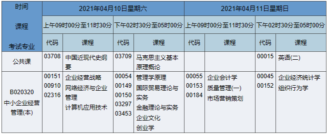 2021年4月湖南自考本科工商管理(原中小企業(yè)經(jīng)營管理)專業(yè)考試時(shí)間為2021年4月10日-11日,2021年4月湖南自考本科工商管理(原中小企業(yè)經(jīng)營管理)專業(yè)課程安排如下: