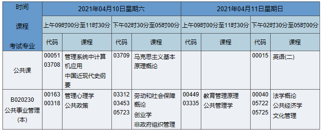2021年4月湖南自考本科公共事業管理專業考試時間為2021年4月10日-11日,2021年4月湖南自考本科公共事業管理專業課程安排如下: