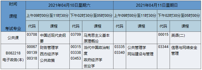 2021年4月湖南自考本科行政管理(原電子政務)專業考試時間為2021年4月10日-11日,2021年4月湖南自考本科行政管理(原電子政務)專業課程安排如下: