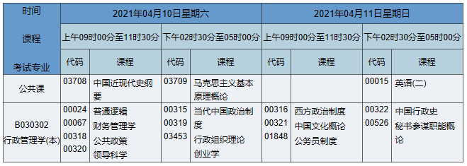 2021年4月湖南自考本科行政管理(原行政管理學)專業考試時間為2021年4月10日-11日,2021年4月湖南自考本科行政管理(原行政管理學)專業課程安排如下: