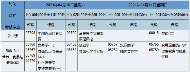 2021年4月湖南自考本科食品衛生與營養學專業考試時間為2021年4月10日-11日,2021年4月湖南自考本科食品衛生與營養學專業課程安排如下: