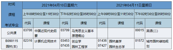 2021年4月湖南自考本科園林專業考試時間為2021年4月10日-11日,2021年4月湖南自考本科園林專業課程安排如下: