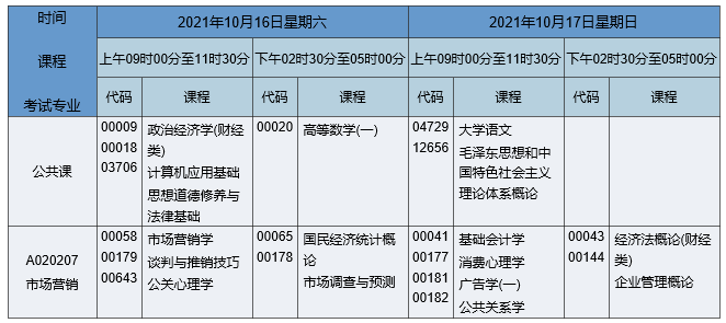2021年10月湖南自考??剖袌鰻I銷專業考試時間為2021年10月16日-17日,2021年10月湖南自考??剖袌鰻I銷專業課程安排如下: