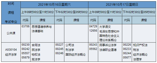 2021年10月湖南自考專科法律事務(wù)(原經(jīng)濟(jì)法學(xué))專業(yè)考試時(shí)間為2021年10月16日-17日,2021年10月湖南自考專科法律事務(wù)(原經(jīng)濟(jì)法學(xué))專業(yè)課程安排如下: