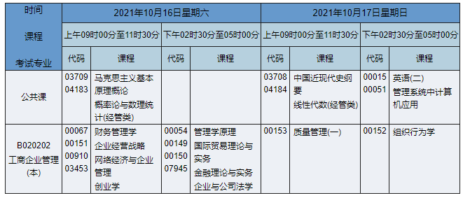 2021年10月湖南自考本科工商管理(原工商企業管理)專業考試時間為2021年10月16日-17日,2021年10月湖南自考本科工商管理(原工商企業管理)專業課程安排如下: