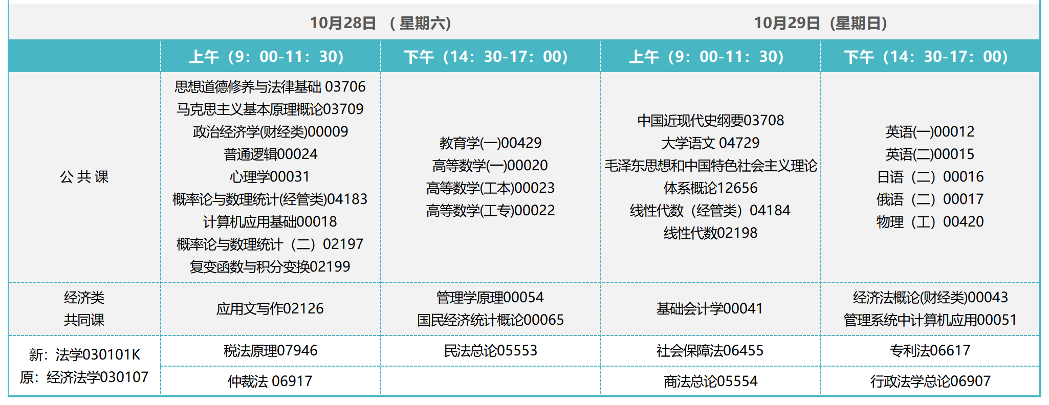 2023年10月吉林自考本科法學專業,專業代碼為030101K,考試時間為10月28日、29日,上午考試安排在9:00-11:30,下午考試安排在14:30-17:00。