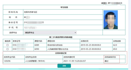 4.選擇要申請畢業的專業,然后選擇考生其他準考證號下的成績,點擊合檔按鈕提交合檔申請。