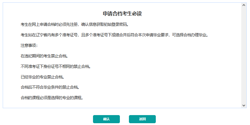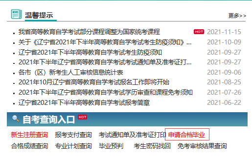 1.考生通過瀏覽器訪問遼寧省高等教育自學考試網上服務平臺后,點擊自考查詢入口中的“申請合檔畢業”鏈接進行申請。