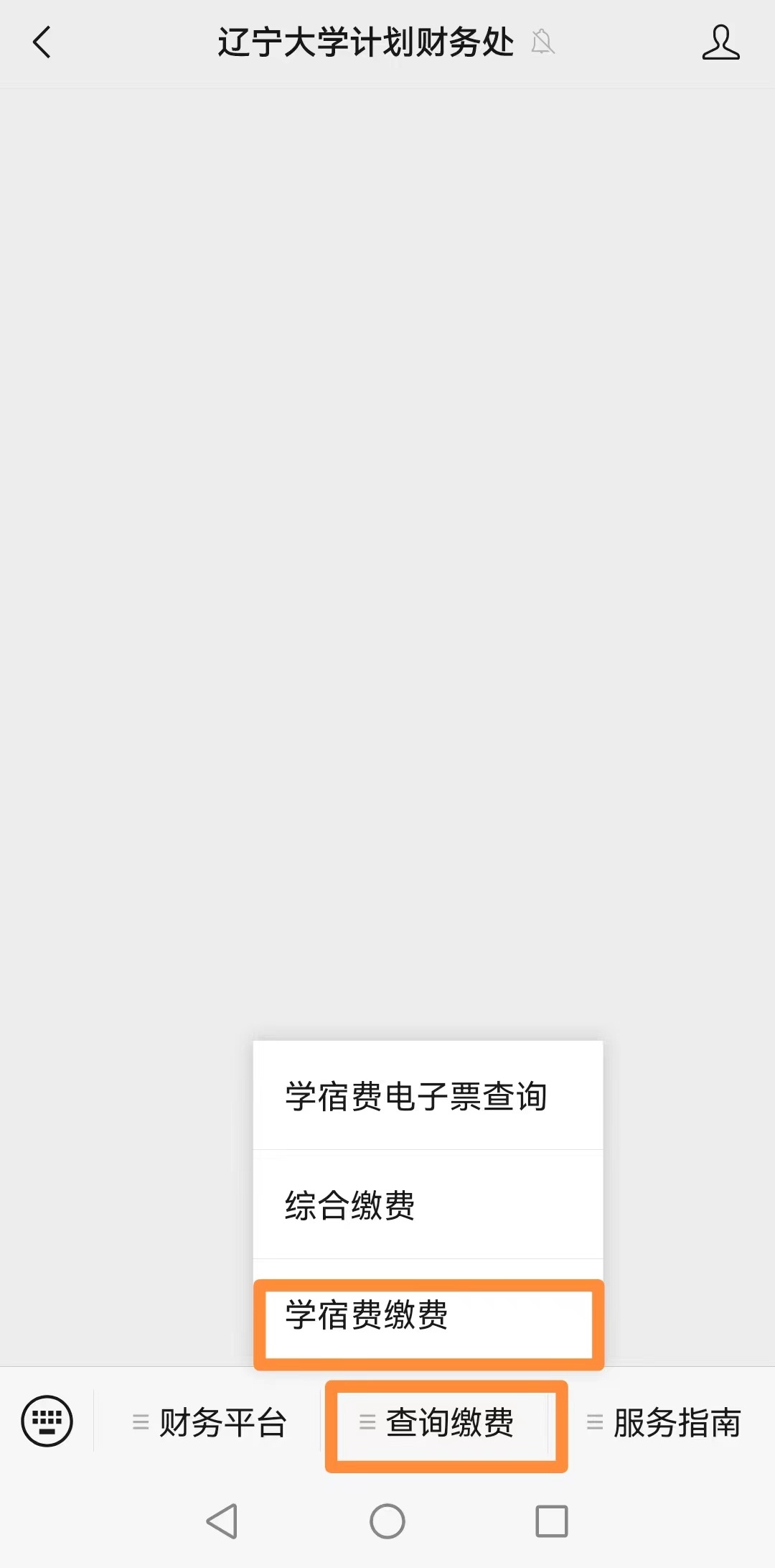 1.登錄微信,微信中搜索并關(guān)注“遼寧大學(xué)計劃財務(wù)處”微信公眾號,通過下方“查詢繳費(fèi)”,選擇“學(xué)宿費(fèi)繳費(fèi)”進(jìn)入“校園統(tǒng)一支付平臺”登錄界面。也可登錄網(wǎng)址http://xysf.lnu.edu.cn/xysf/直接進(jìn)入“校園統(tǒng)一支付平臺”登錄界面。