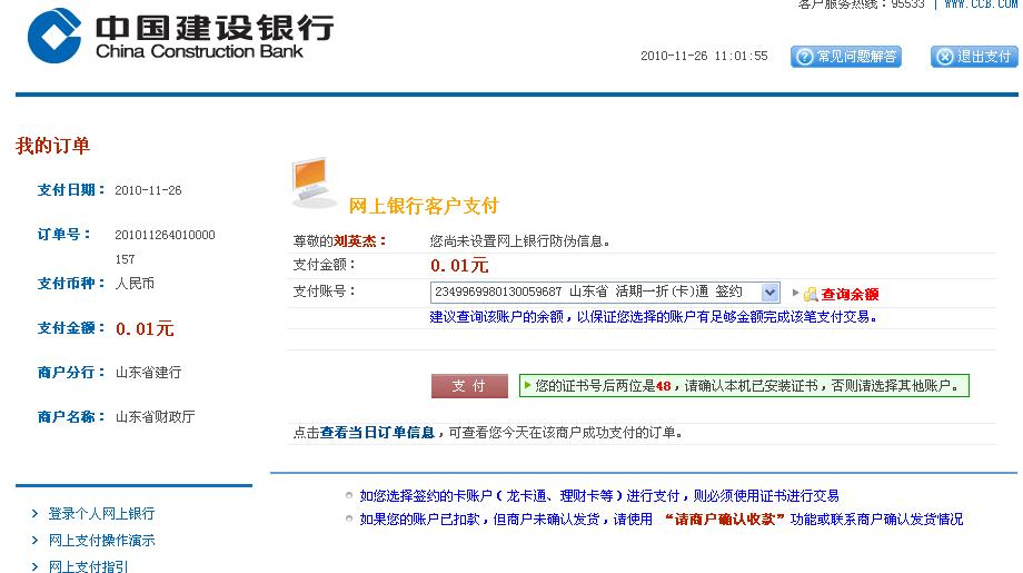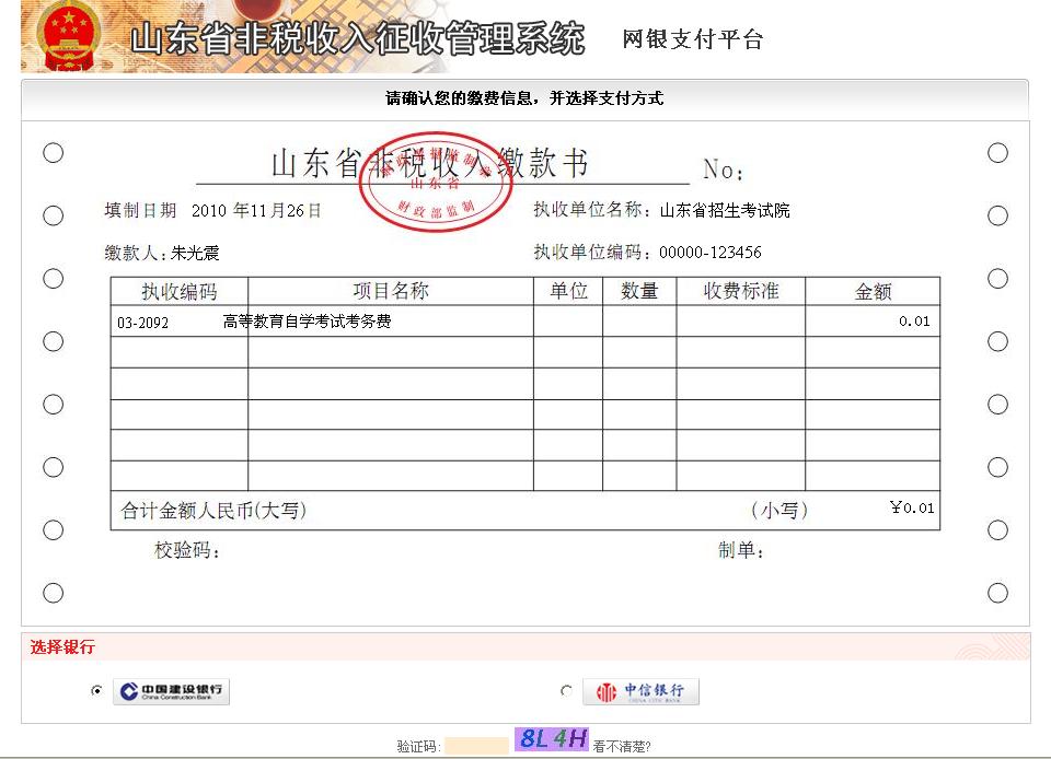 山東自考建設銀行網上支付說明