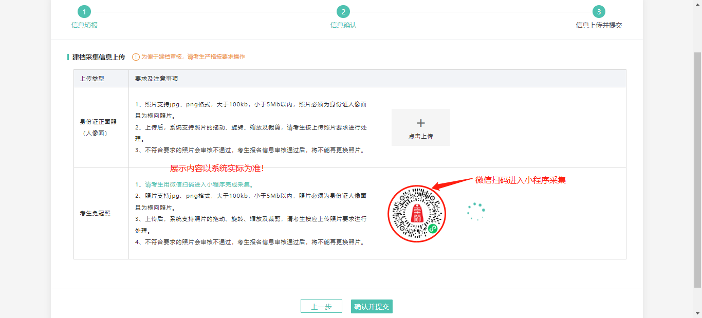 進入信息上傳并提交頁面后,請考生按照要求,上傳身份證正面照片、使用微信掃碼進入小程序完成免冠照片采集。