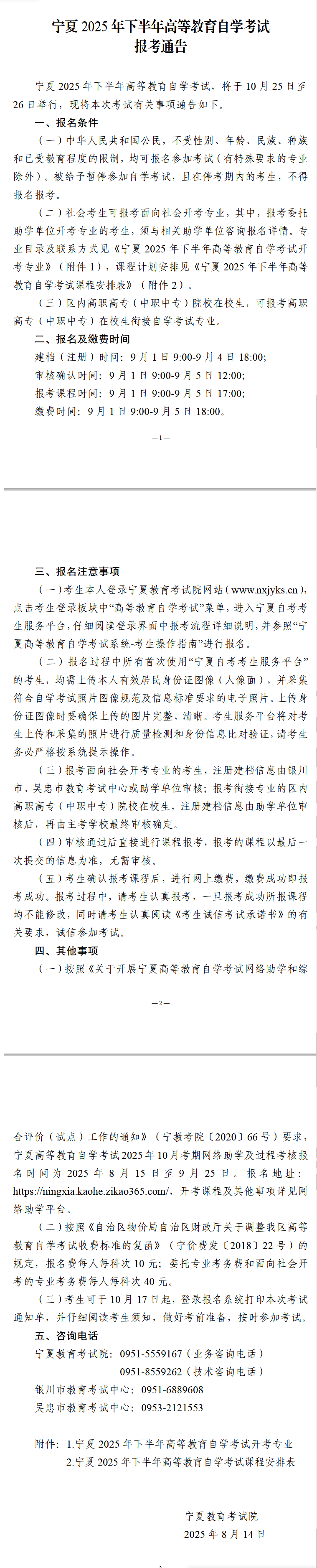 寧夏 2025 年下半年高等教育自學考試課程安排表