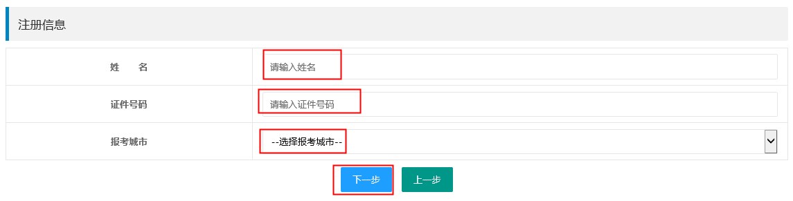 3、填寫姓名、證件號、選擇報考城市后,點擊下一步。