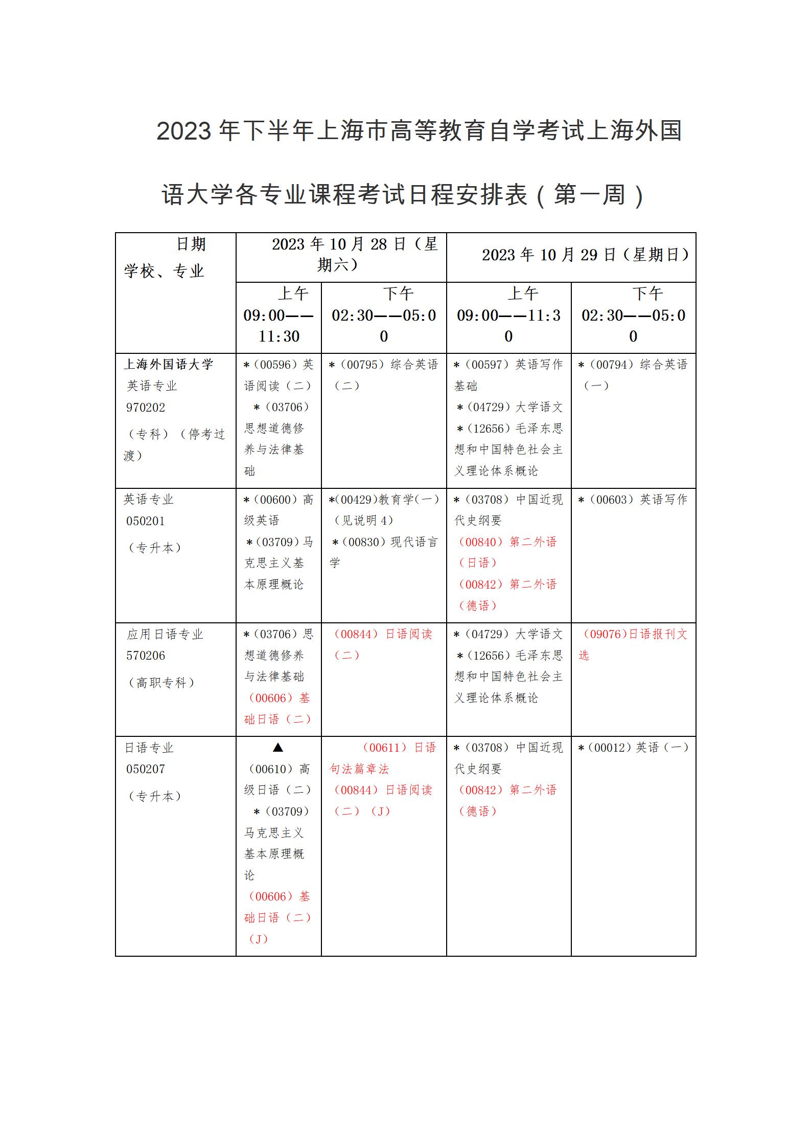 - 2023年下半年上海外國語大學(xué)自考各專業(yè)課程考試日程安排表