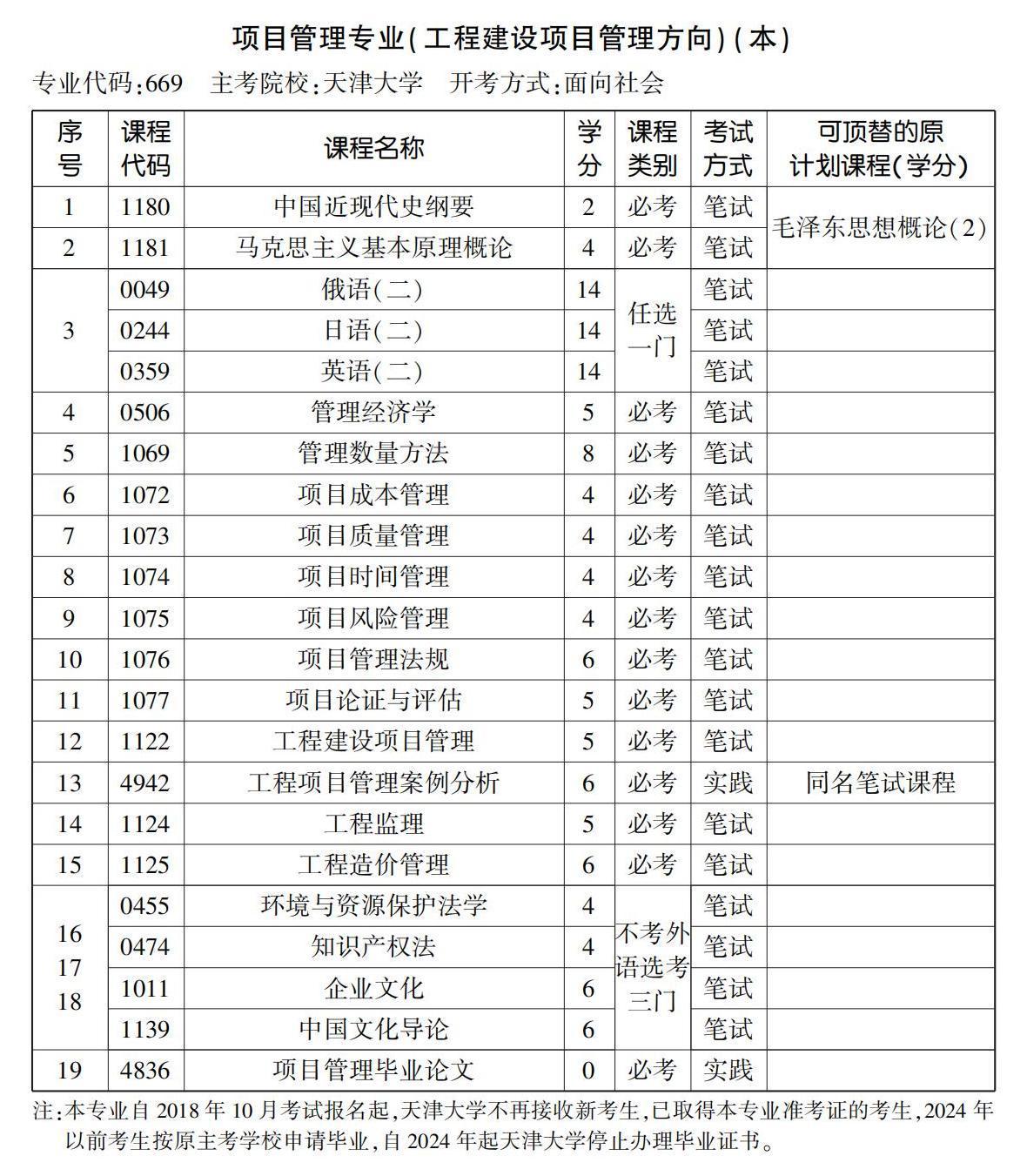 2022年10月天津自考本科項(xiàng)目管理(工程建設(shè)項(xiàng)目管理方向)專業(yè)計劃(停考過渡)