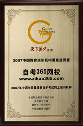 由天下英才傳媒、中國職業教育與就業協會、聯信天下調研機構與中國消費者調查網主辦的國內首個面向全國十多萬家大專院校和培訓機構開展的學員滿意度調查結果于2007年12月揭曉,“自考365網校(m.ssgshop.cn)”榮獲“2007年學員滿意培訓機構”稱號。 |