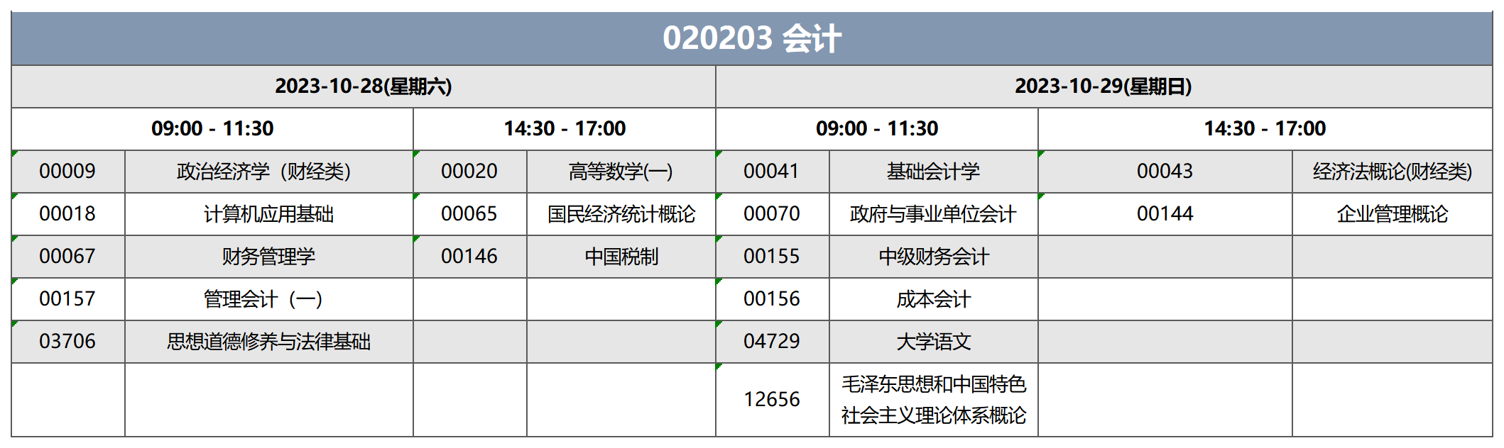 對比專業計劃和考試安排發現,西藏10月考期自考會計專科各科筆試均正常安排考試,無論你報考了哪一科,都能在10月28/29日兩天參加筆試考試。
