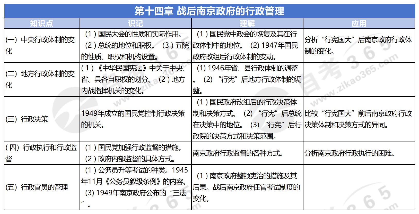 自考中國行政史這一科,教材各章節(jié)考點都要好好掌握。中國行政史教材第十四章-戰(zhàn)后南京政府的行政管理,考生應(yīng)著重學(xué)習(xí)以下知識點,并按理解應(yīng)用要求,把握好學(xué)習(xí)程度,這樣就能更有重點地學(xué)習(xí),更省心省力。