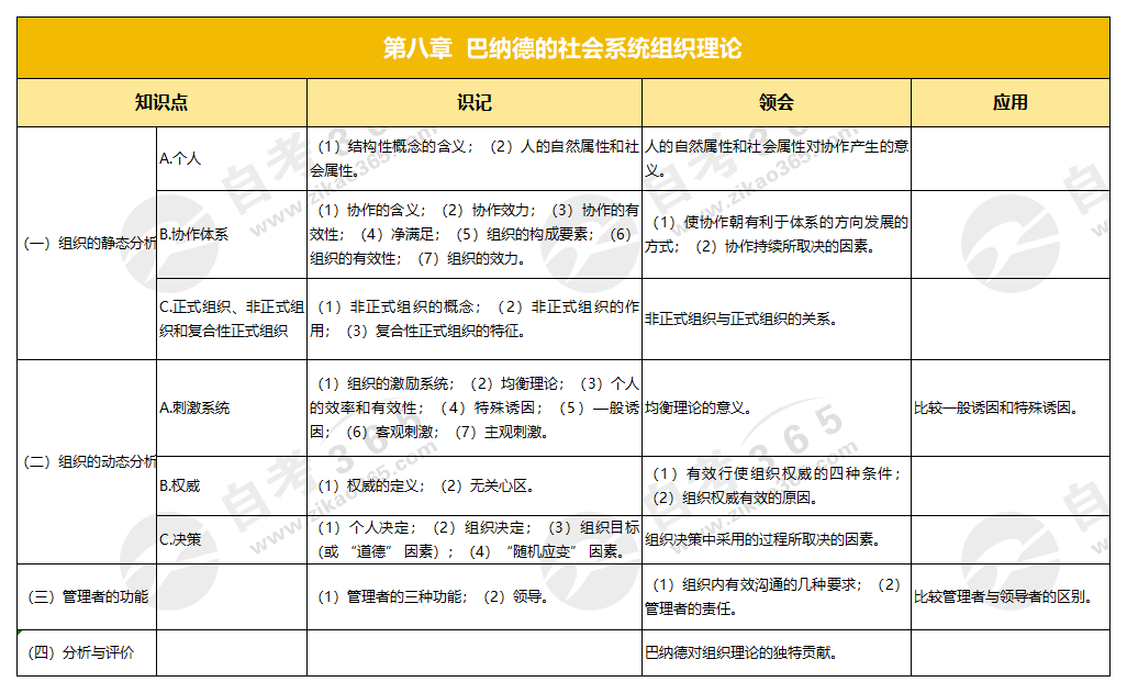 自考365為廣大考生整理了《西方行政學說史(2001版)》這一科各個章節考點的學習要求,考生只需針對不同類型的知識點,按識記、領會、應用三種層次來學習和練題,就可以學得更得心應手。