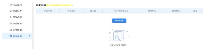 2、點(diǎn)擊“轉(zhuǎn)出申請(qǐng)”按鈕,在考生信息確認(rèn)頁(yè)面填寫(xiě)個(gè)人信息、轉(zhuǎn)出原因、轉(zhuǎn)出省及準(zhǔn)考證信息等,在選擇需要轉(zhuǎn)考的課程合格成績(jī)。