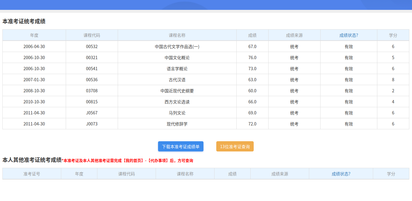 點擊“我的成績”菜單,可以查詢登陸準考證的統考成績、其他成績、本人其他準考證的成績。頁面如下: