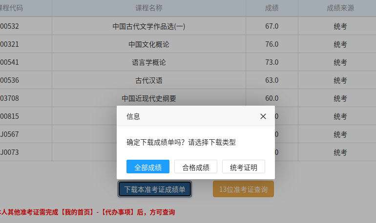 點擊“下載本準考證成績單”,可以下載“全部成績”、“合格成績”、“統考證明”(含公章)。
