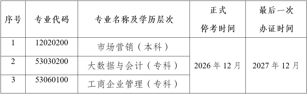 一、市場營銷本科、大數據與會計專科、工商企業管理專科三個專業從2024年12月起停止新考生報名。對已取得考籍仍未畢業的考生,設置2年過渡期,過渡期內繼續安排以上三個專業的課程考試,過渡2年后正式停考,2026年12月起不再安排停考專業相關課程的考試。最后一次辦理畢業證時間為2027年12月。