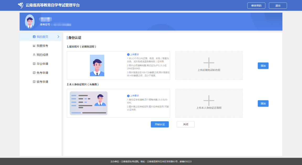 (1)普通考生,點擊“添加”,分別上傳報名照片(近期免冠照)、本人身份證照片(頭像面),上傳成功后,點擊“開始認證”,認證過程中,會與可信來源進行考生身份認證認證內容為:
