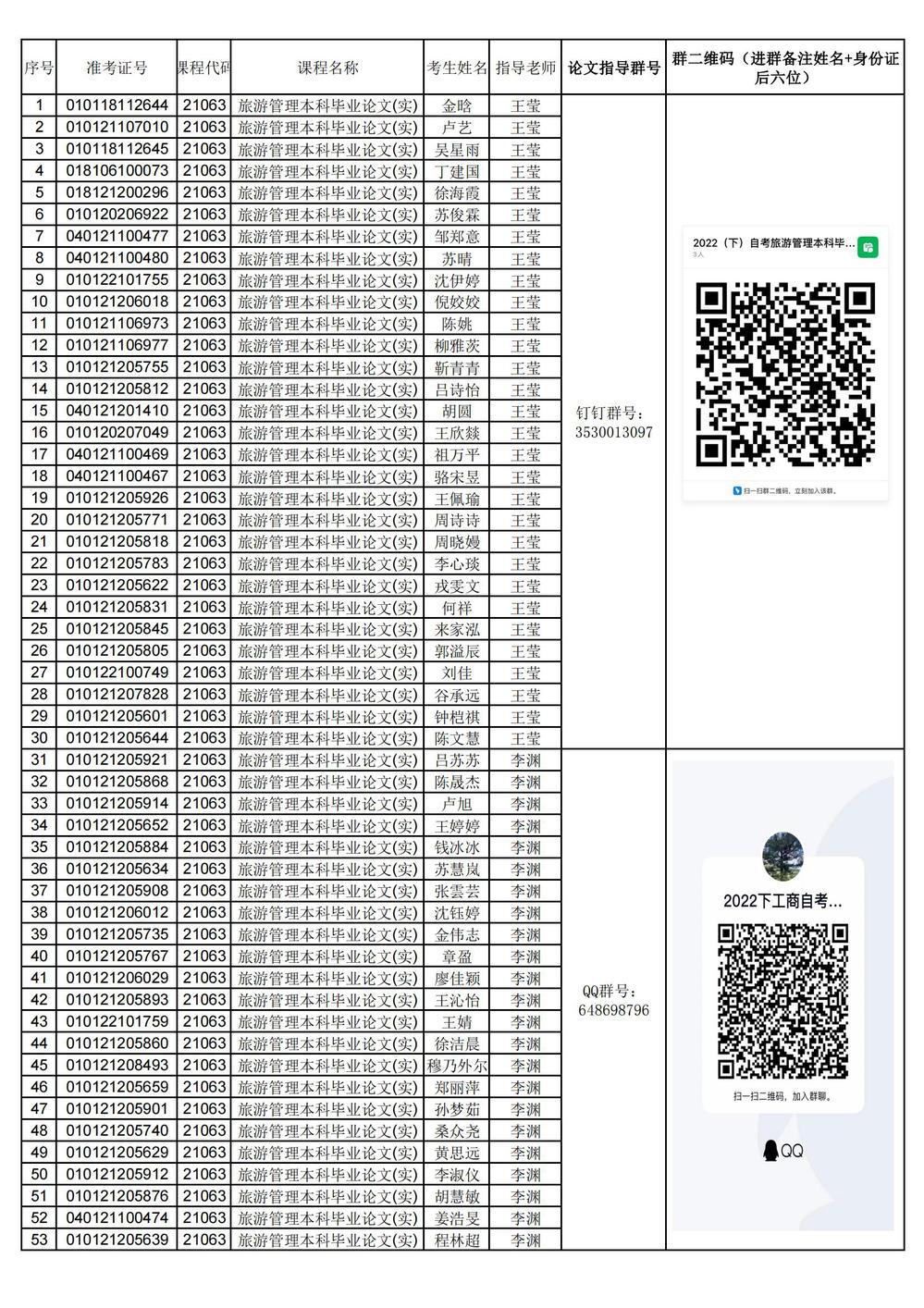 浙江工商大學2022年(下)自考畢業論文指導教師安排(旅游管理)